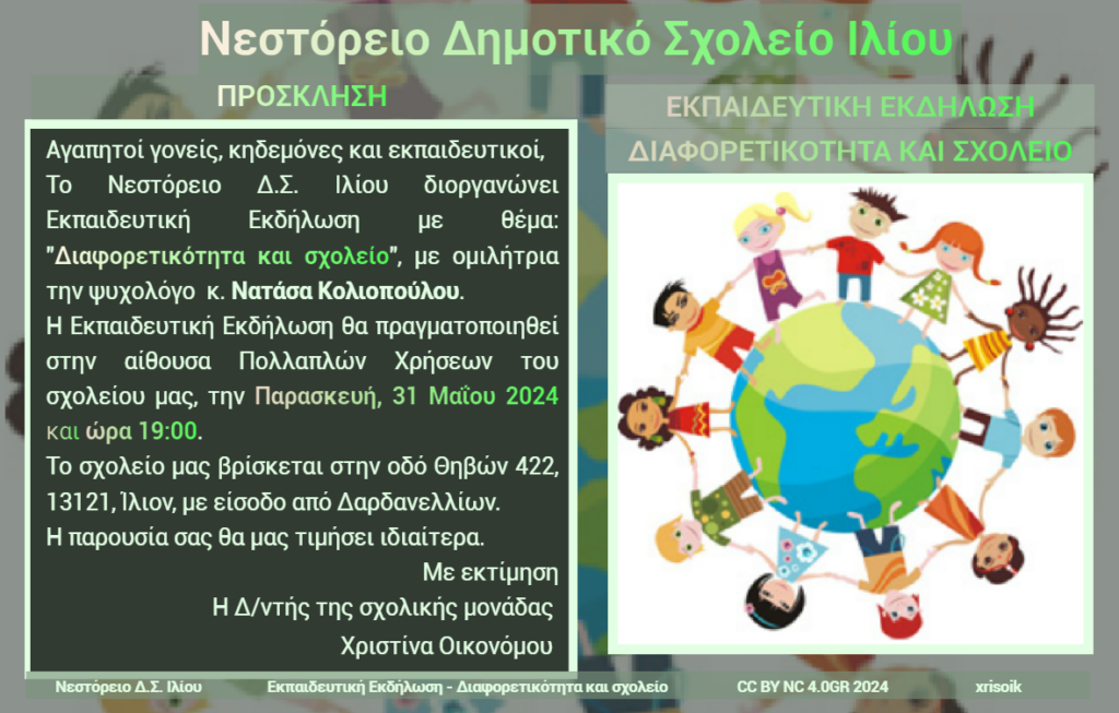 27 Μαϊος 2024 Εκπαιδευτική Εκδήλωση - Διαφορετικότητα και σχολείο Αγαπητοί γονείς, κηδεμόνες και εκπαιδευτικοί, Περισσότερα...